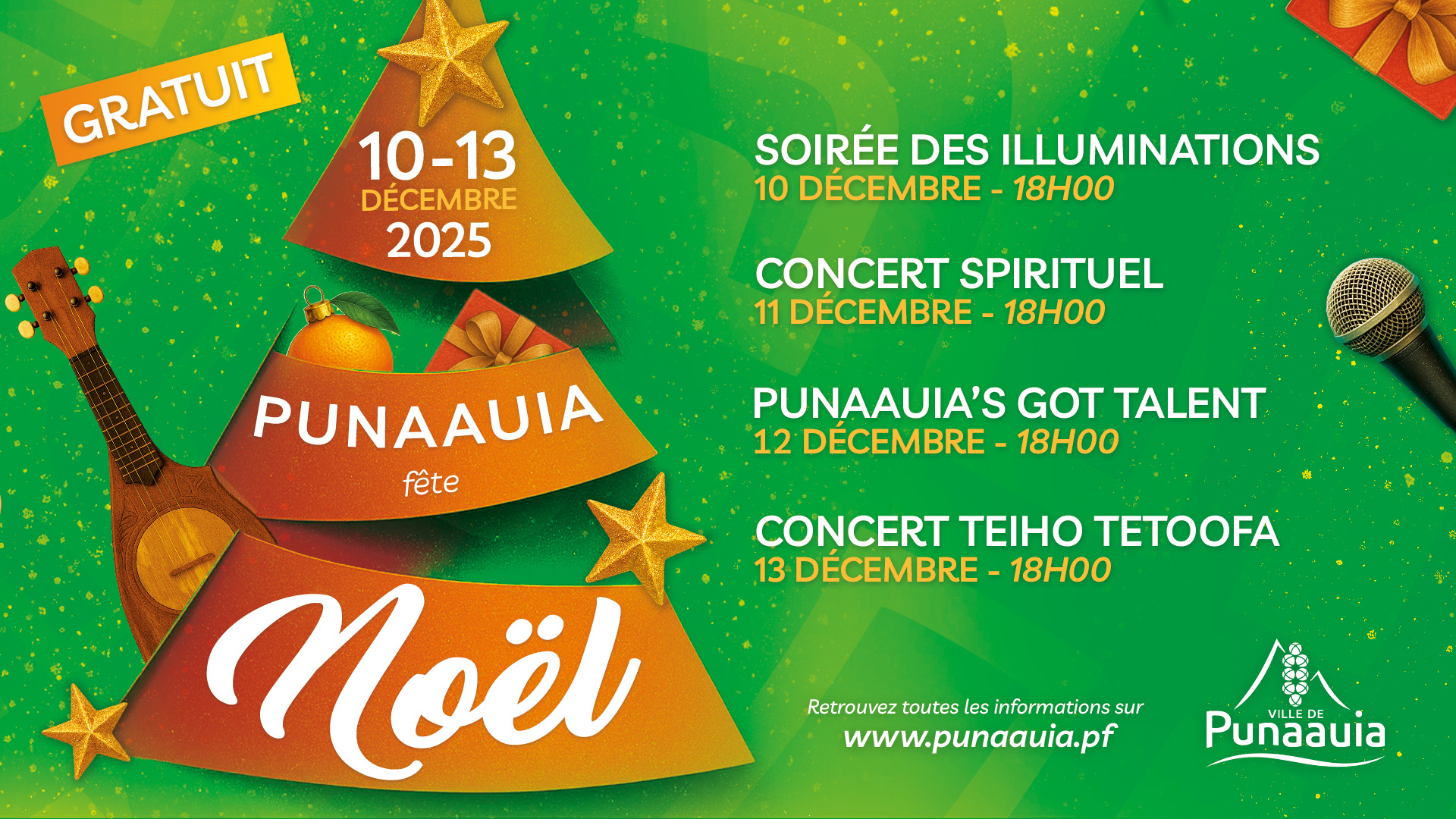 La Ville de Punaauia est heureuse de vous inviter à célébrer ensemble la magie de Noël lors de quatre jours d’animations entièrement gratuites, du 10 au 13 décembre. Un programme riche, festif et familial vous attend pour illuminer vos soirées et partager l’esprit des fêtes dans la bonne humeur.