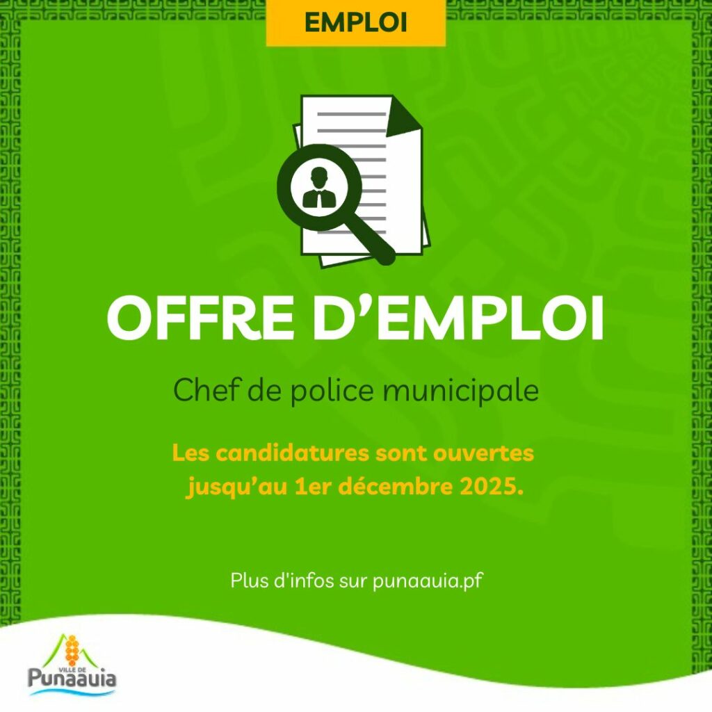 La ville de Punaauia ouvre un poste de Chef de police municipale afin de renforcer sa stratĂ©gie de sĂ©curitĂ© publique, dâencadrement opĂ©rationnel et de proximitĂ© avec la population.