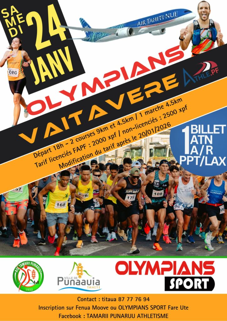 L’association Tamari’i Punaruu Athlétisme organise en partenariat avec OLYMPIANS SPORT et la Ville de Punaauia, la course mythique sur les hauteurs de Punaauia « Olympians Vaitavere », samedi 24 janvier 2026 avec un départ à 18h devant le stade Punaruu.
