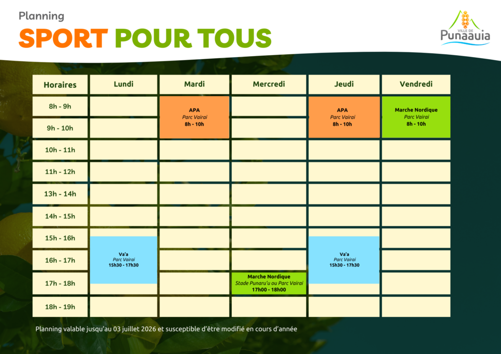 Ces activitĂ©s sportives sâadressent aussi bien aux jeunes, quâaux adultes et aux personnes ĂągĂ©es. Elles sont ouvertes Ă tous les rĂ©sidents de Punaauia quel que soit leur condition physique. Elles sont entiĂšrement gratuites !