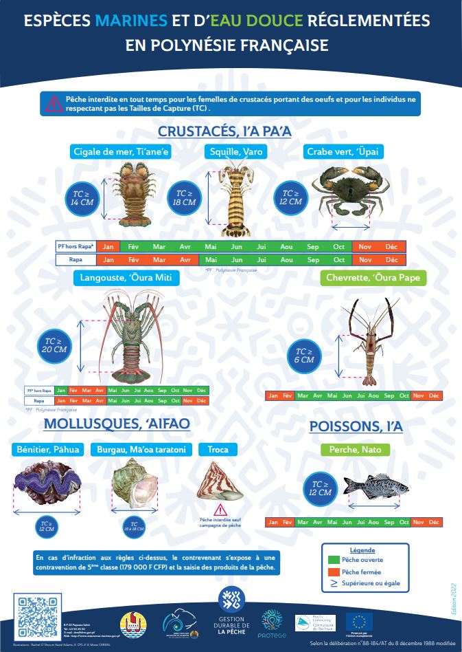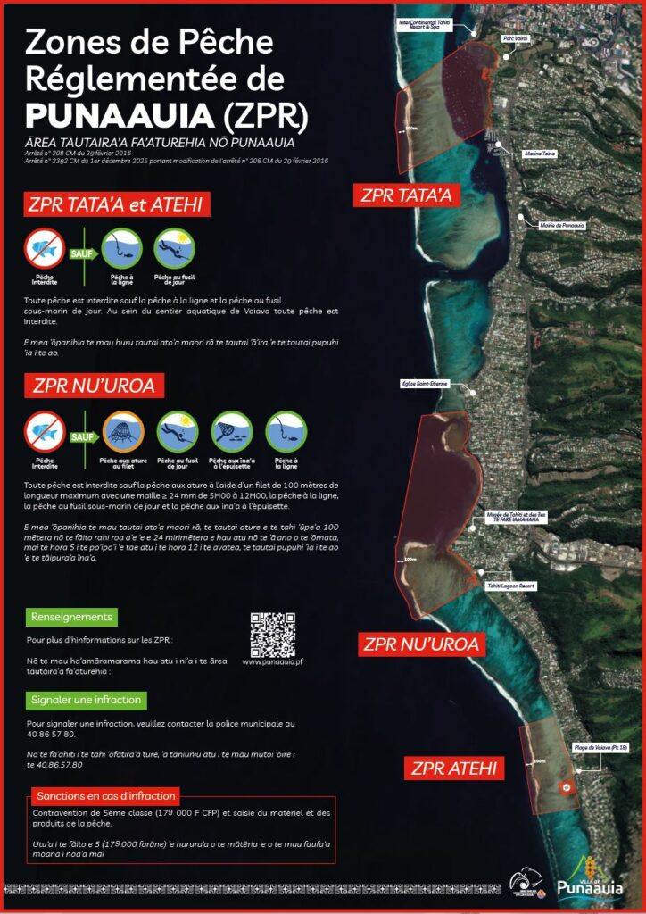 Important : Certaines espĂšces marines sont protĂ©gĂ©es et leur pĂȘche est interdite sur lâensemble de la PolynĂ©sie française, y compris dans les ZPR de Punaauia.