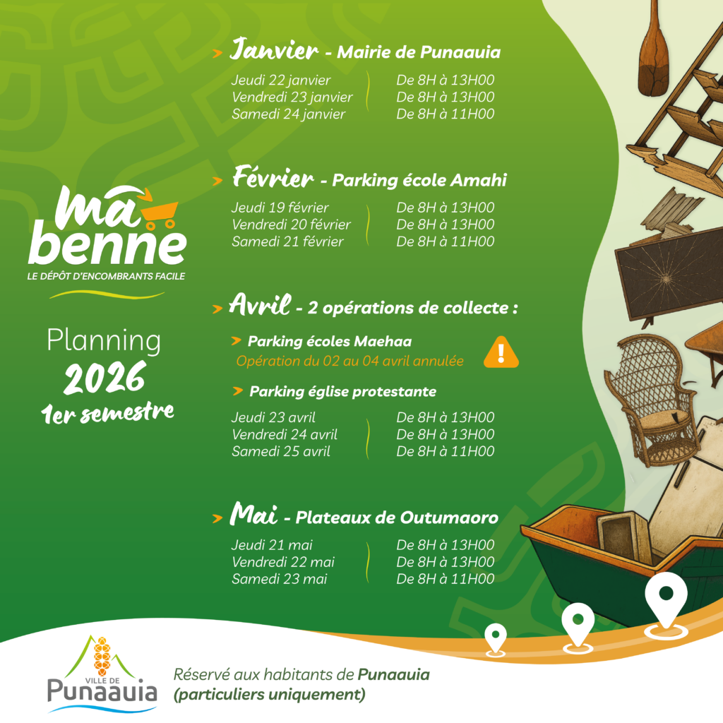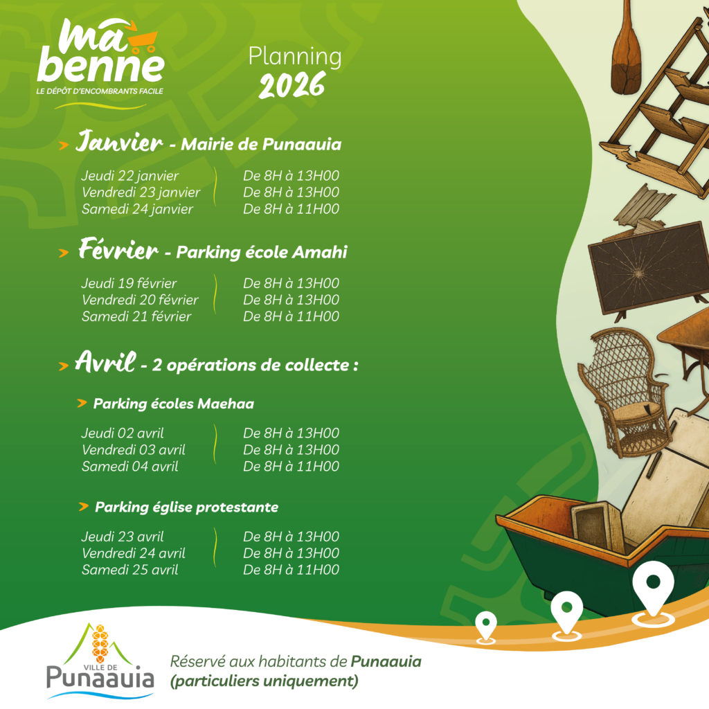 Ce nouveau service, mis en place une fois par mois dans différents quartiers de Punaauia, vous permet de vous débarrasser facilement de vos déchets encombrants.
