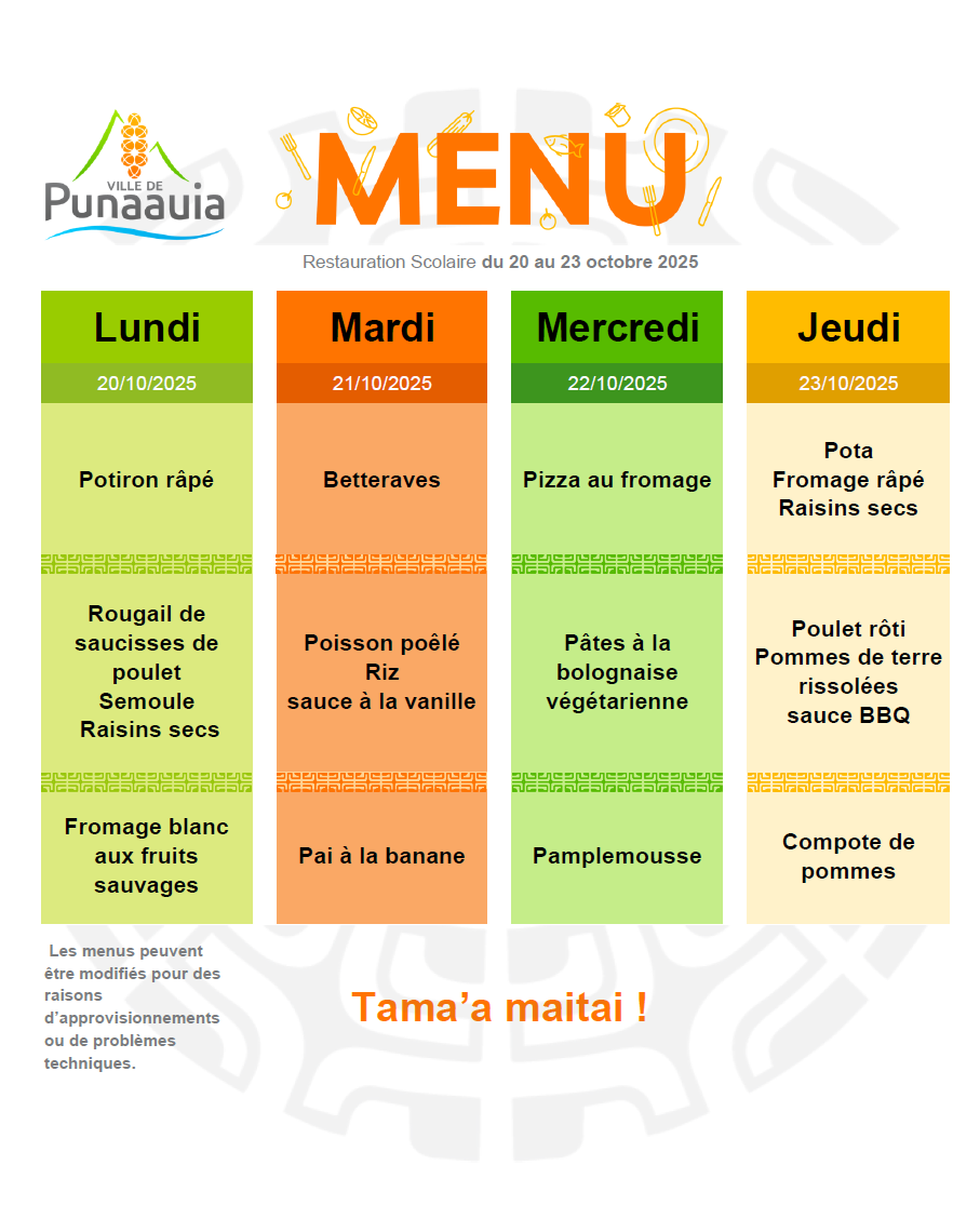 Cette rubrique vous permet de découvrir les menus prévus chaque semaine par le service municipal de restauration scolaire de Punaauia.