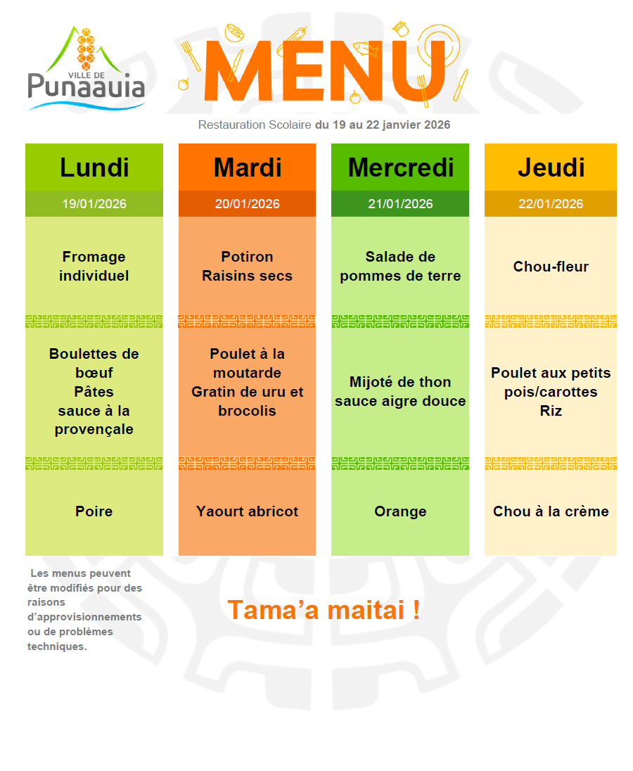 Cette rubrique vous permet de découvrir les menus prévus chaque semaine par le service municipal de restauration scolaire de Punaauia.
