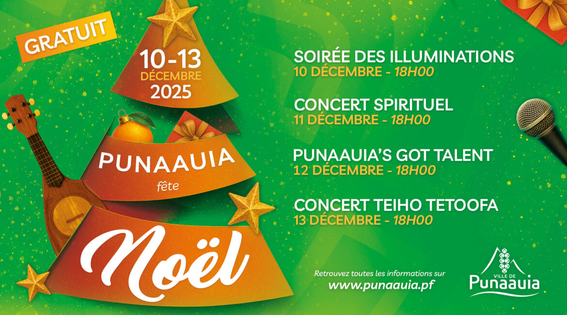 Dans le cadre des festivitĂ©s de NoĂ«l, la Ville de Punaauia organise le 12 dĂ©cembre 2025 lâĂ©vĂšnement « Punaauiaâs got talent ». Une grande soirĂ©e qui verra sâaffronter les meilleurs artistes de la ville dans trois catĂ©gories : Meilleur groupe de danse Hip-Hop Meilleure chanson/composition musicale Meilleur âĆ«tÄ âarearea Cette soirĂ©e mettra Ă ...
