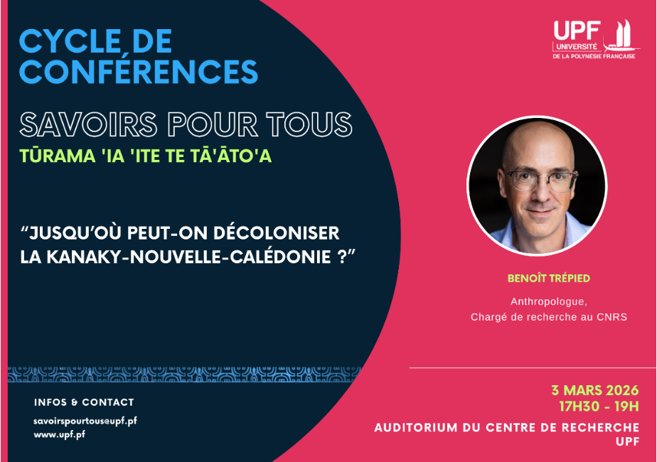 Ouvert à tous Le Mardi 3 mars 2026 de 17h30 à 19h00 à l’université de la Polynésie française (Auditorium du centre de recherche) Présentation de la conférence Le 13 mai 2024, la Kanaky-Nouvelle-Calédonie a connu un embrasement sans précédent qui fera date. Les dégâts humains, matériels et politiques ont été...